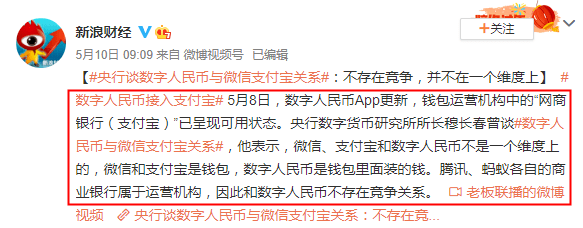 据他介绍,微信、支付宝和数字人民币不是一个维度上的,微信和支付宝是钱包,数字人民币是钱包里面装的钱。腾讯、蚂蚁各自的商业银行属于运营机构,因此和数字人民币不存在竞争关系。