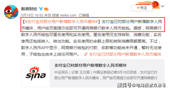 网商银行成为第七家数字人民币试点银行,支付宝已对部分用户新增数字人民币模块,用户按页面提示后即可开通网商银行数字人民币钱包。