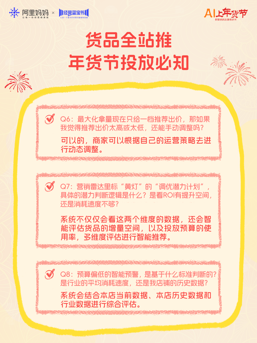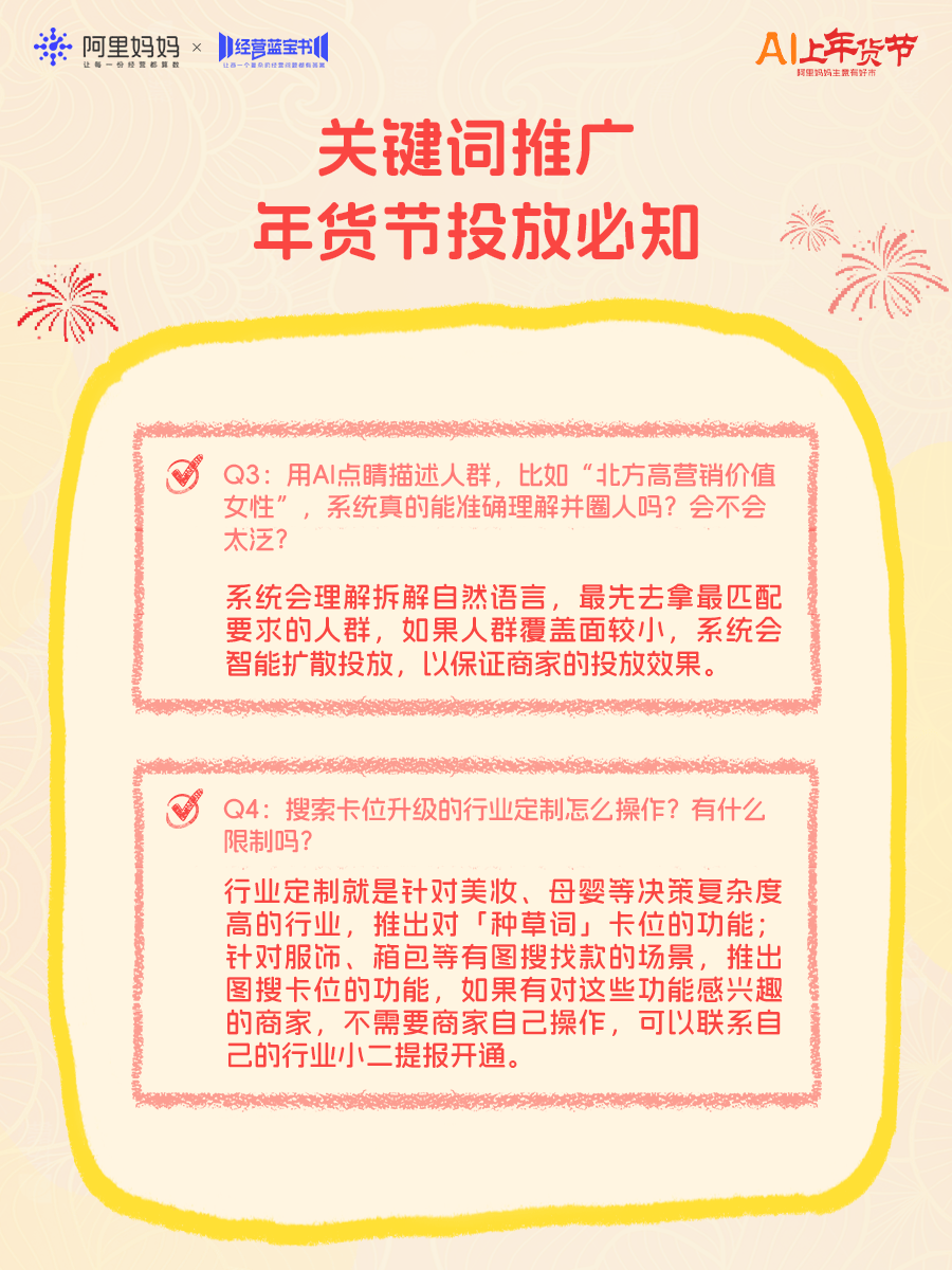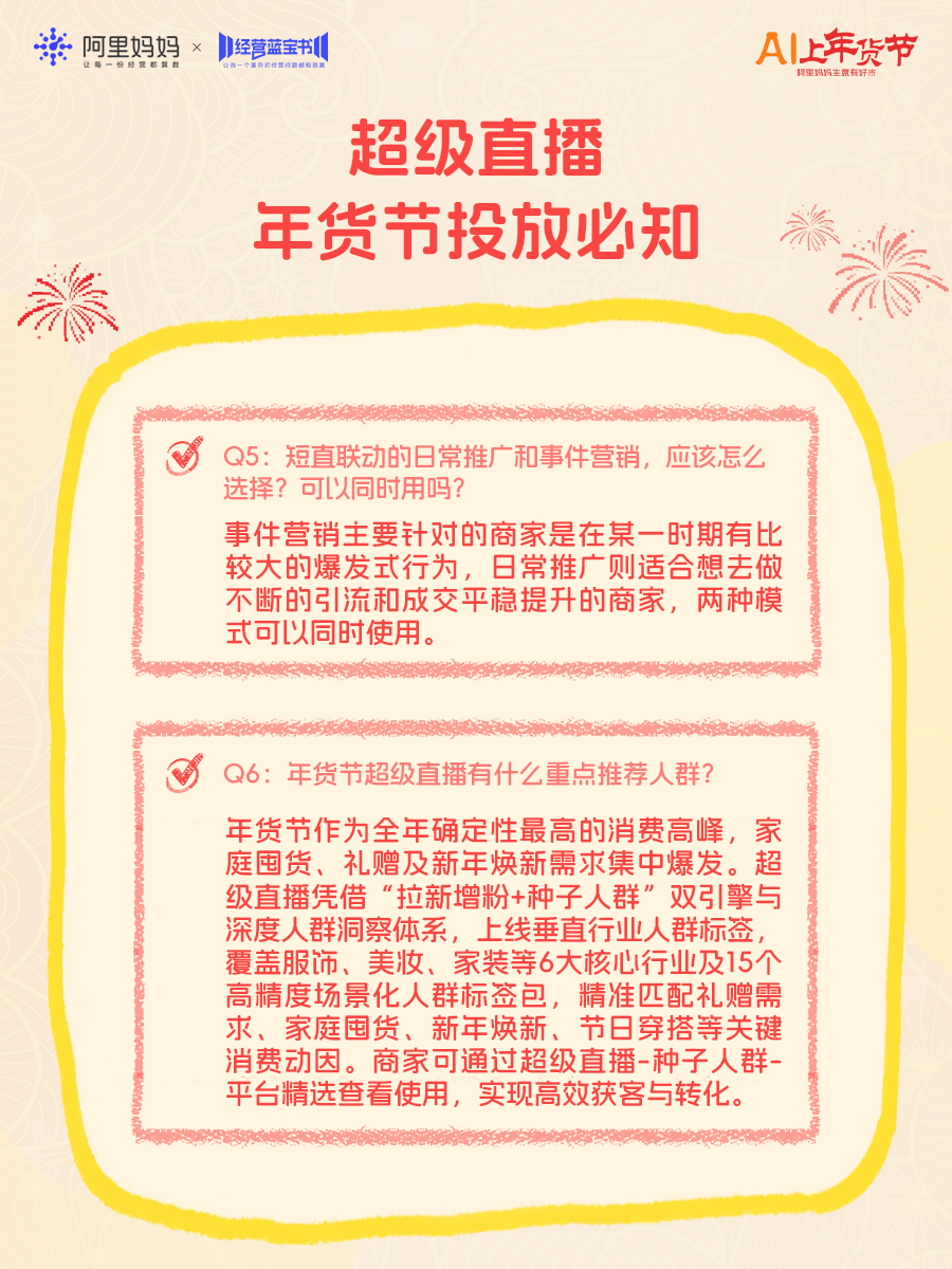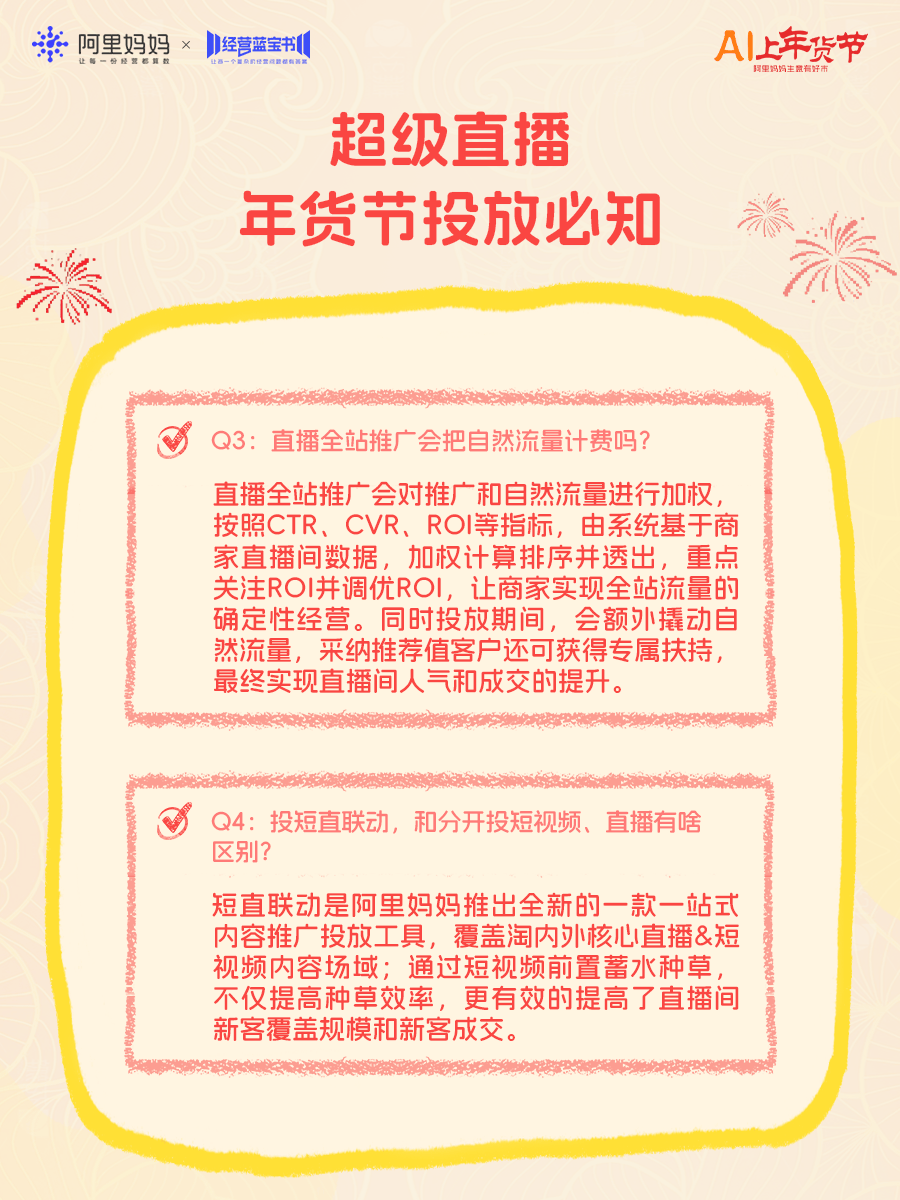 年货节平台流量显著上涨,为帮助更多商家抓住流量高峰、马上爆单,阿里妈妈今日推出《年货节产品实操100问》直播,为商家带来“四步爆单”产品投放攻略,并逐一拆解近百个实操难题,强推商家赢在年关!