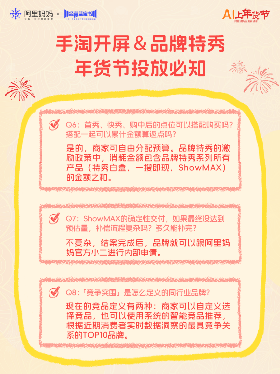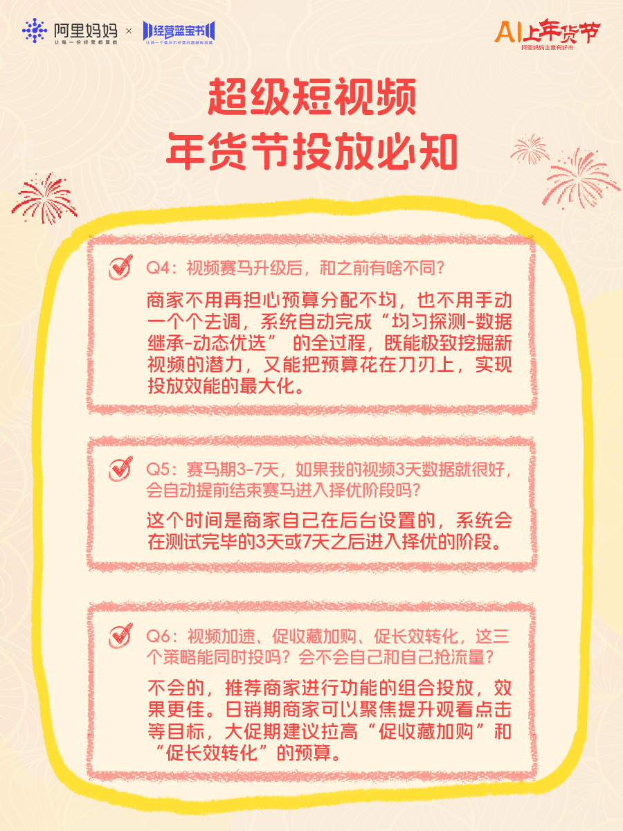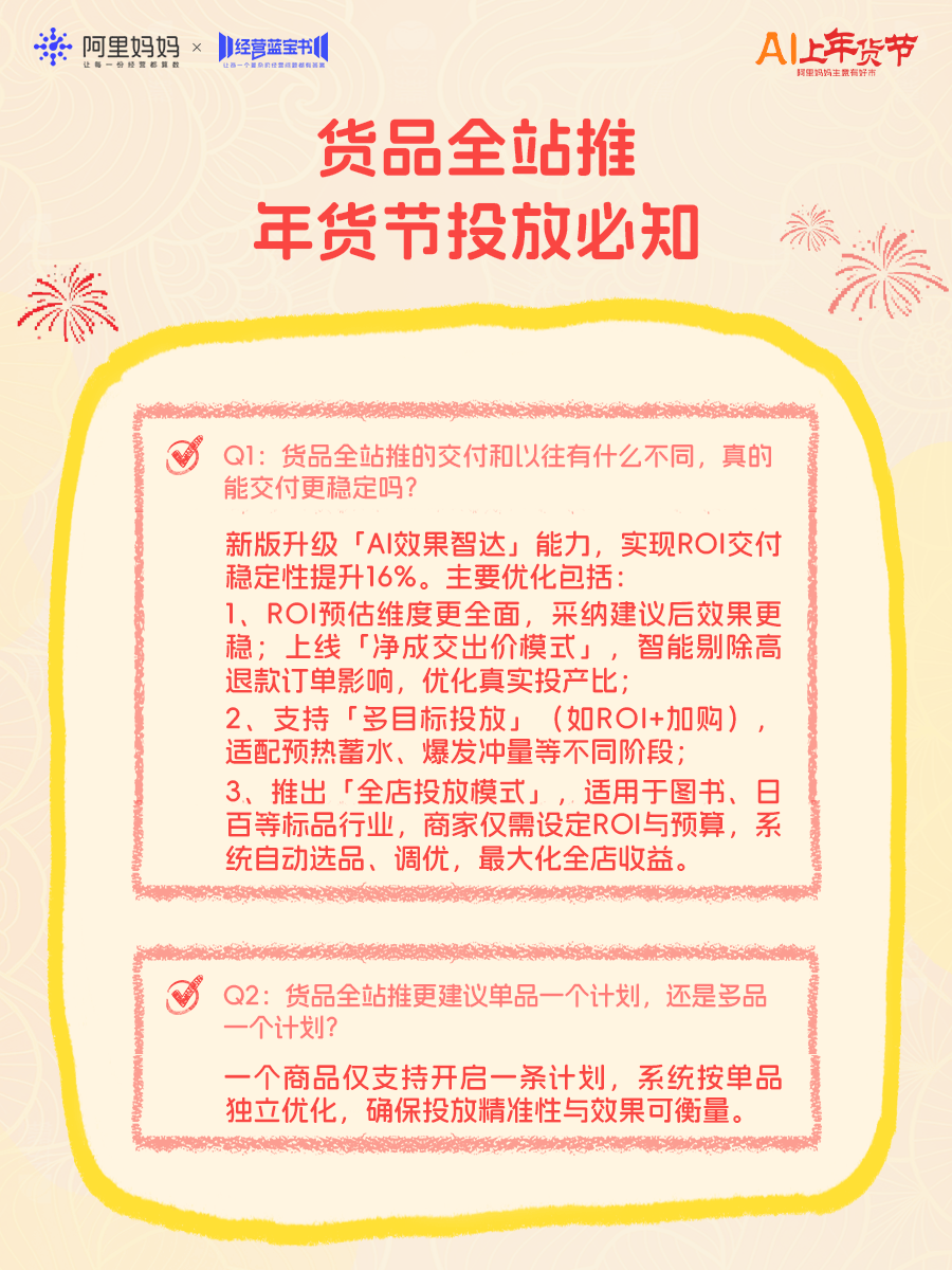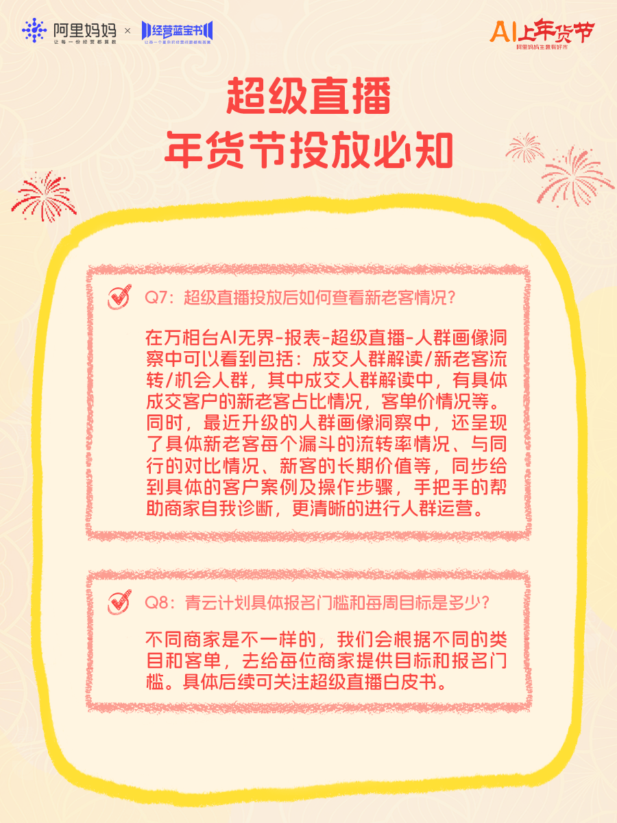 年货节平台流量显著上涨,为帮助更多商家抓住流量高峰、马上爆单,阿里妈妈今日推出《年货节产品实操100问》直播,为商家带来“四步爆单”产品投放攻略,并逐一拆解近百个实操难题,强推商家赢在年关!