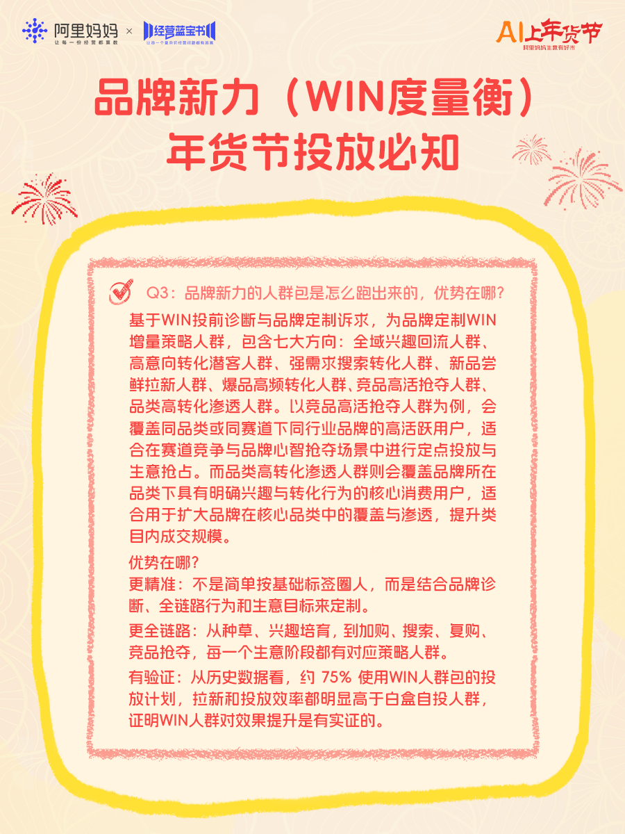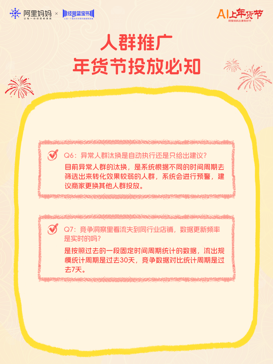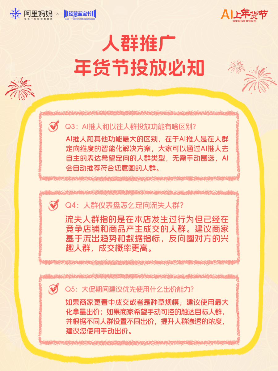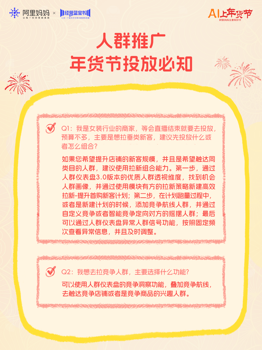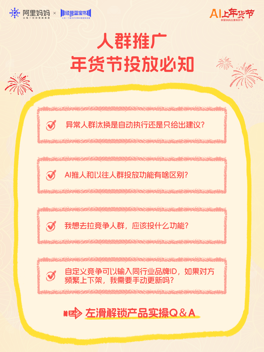 人群推广在年货节提供了一套完整的“人群资产智能运营系统”:从「人群仪表盘」3.0全局洞察调优,到「竞争拉新」主动获客,再到「常客转化」的深度变现和「AI推人2.0」的智能提效,一套产品打通“找人—拉人—留人—转化”,店铺获客拉新更高效。