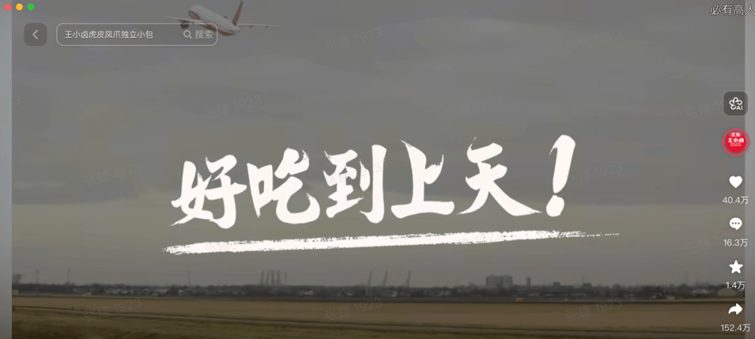 具体来说,王小卤奉行内容的“三高”原则:高趣味性、高互动性、高关联性。其抖音官方账号置顶的一条视频堪称经典:没有产品特写,没有卖点咆哮,仅15秒画面——一架长着鸡爪的飞机伴着魔性音效缓缓起飞,文案仅五个字——“好吃到上天”。