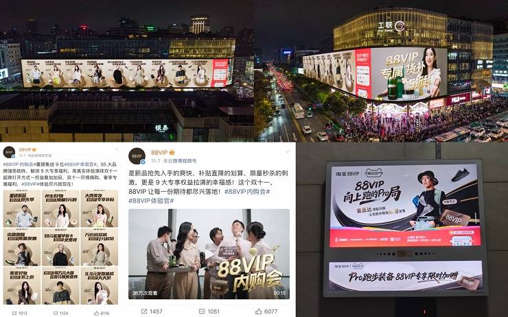 活动期间,除折上95折、大牌内购会等权益外,会员还可享“短袖外套1元起秒杀” “88VIP专享跑步尖货加赠”等独家权益,高端运动装备触手可及。此外,88VIP还整合了会员中心、App开屏、新品尝鲜频道等站内的亿级曝光资源,并在南京千块电梯分众大屏、杭州西湖工联CC巨幕投放,全域覆盖目标人群,确保每一位跑步爱好者都能看到这场专属福利。微博话题#向上跑的Pro局# 曝光量更突破千万级,成功将线上促销升级为一场席卷跑步爱好者的文化事件。