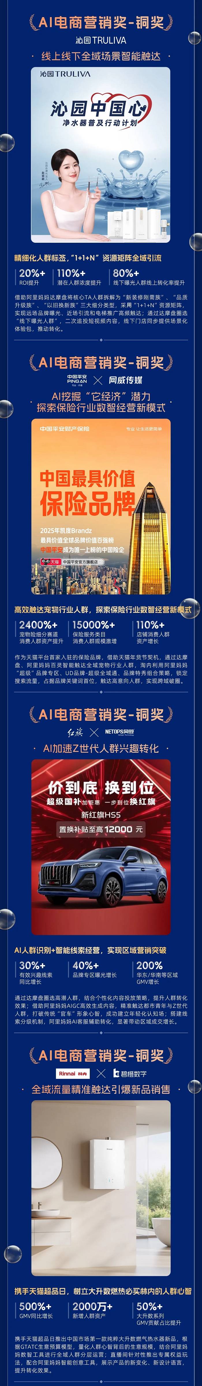 通过AI人群识别+智能线索经营,红旗有效兴趣线索同比增长超30%,品牌专区曝光增长超40%,华东/华南等区域GMV增长200%,获得「AI电商营销奖」铜奖。