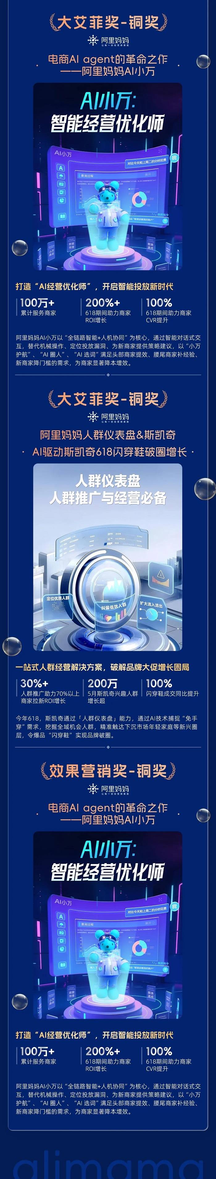 值得关注的是,阿里妈妈自有AI产品同样实力出圈。阿里妈妈AIGC创意荣获「效果营销奖」银奖、「大艾菲奖」铜奖,阿里妈妈达摩盘荣获「效果营销奖」银奖,阿里妈妈AI小万荣获「效果营销奖」铜奖、「大艾菲奖」铜奖,人群推广「人群仪表盘」荣获「大艾菲奖」铜奖,全方位印证了阿里妈妈“让每一份经营都算数”的核心理念,更彰显了其在AI技术研发、产品落地与商业助力上的强劲实力。